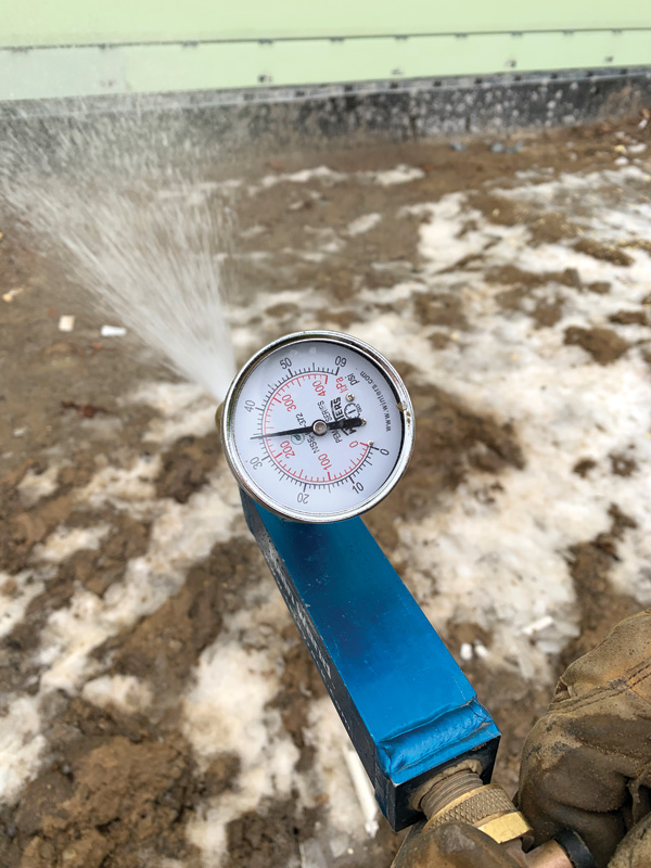 19 mm (0.75 in.) water hose and calibrated spray nozzle. When locating a water source is challenging, portable water tanks may be used to create pressure. Water is sprayed over an area to be tested at 0.3 m (1 ft) away for five minutes. The wall is then monitored for leaks. The process is done during installation, so any leaks found can be repaired prior to installing finishes. Catching leaks early and correcting them can avoid significant costs associated with future leak repairs.