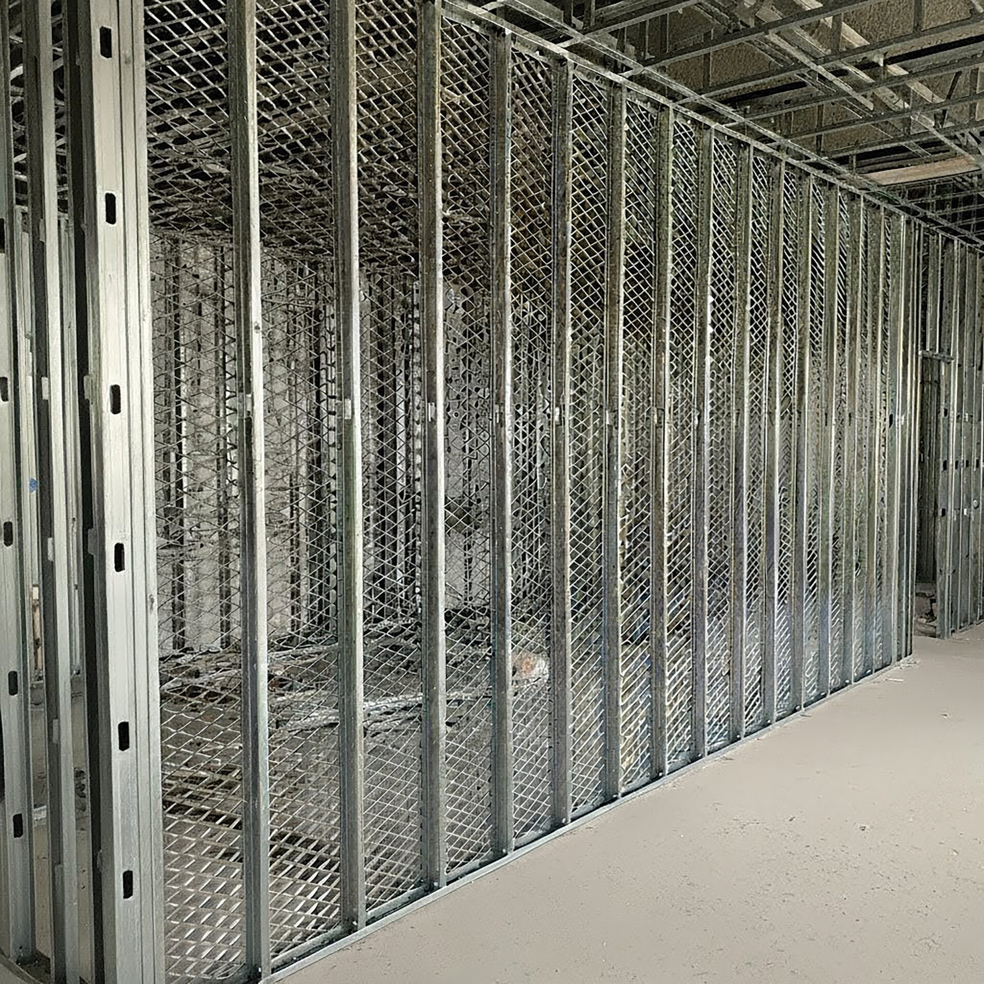 In high-security design, visibility must be balanced with effective protection. Expanded metal offers a solution that excels in both areas, making it ideal for creating secure zones within a larger structure. Its rigid, single-piece construction makes it exceptionally resistant to tampering or access, ideal for applications like supply or inventory lockers, IT server rooms, hazardous areas, or even detention centers. The material’s open mesh allows for non-intrusive surveillance or inspection, providing clear sightlines for monitoring equipment, inventory, or occupants. Expanded metal panels can be configured in multiple ways: bolted to existing walls for a secure boundary, installed from floor to ceiling, or assembled into a fully enclosed cage. For an even higher level of protection, flattened sheets can be attached to wall and ceiling studs, or embedded within concrete layers to create a formidable barrier against forced entry in high-target environments like banks or jewelry stores.