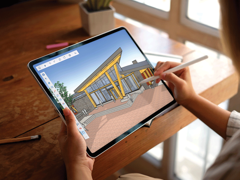 A woman's hands are shown holding a stylus pen, working on a rendering of the exterior of a building on a tablet.