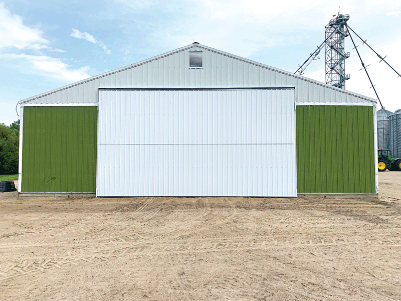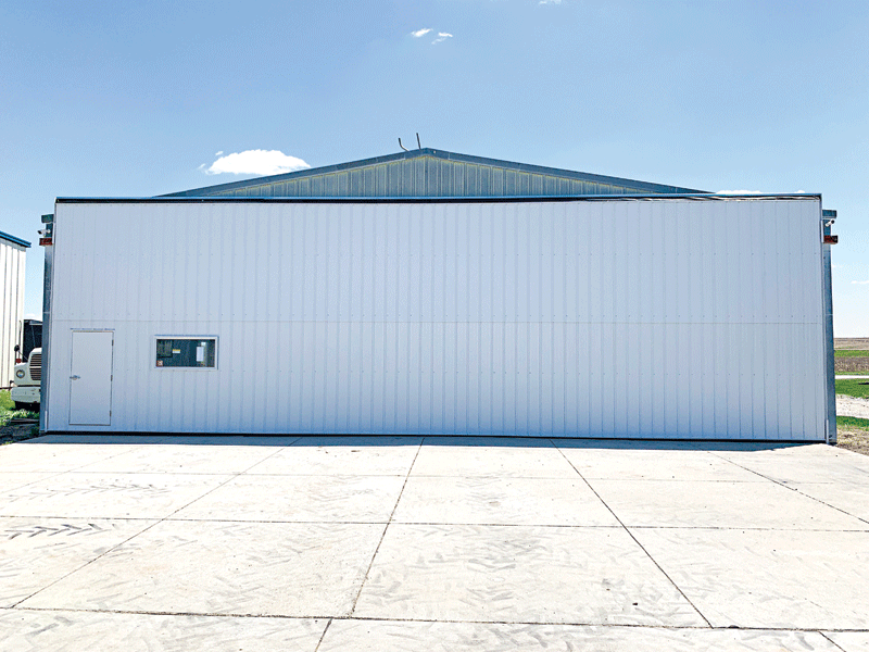 This is the before shot of the front of an airplane hangar with a white roof and door, with green accents on the sides.