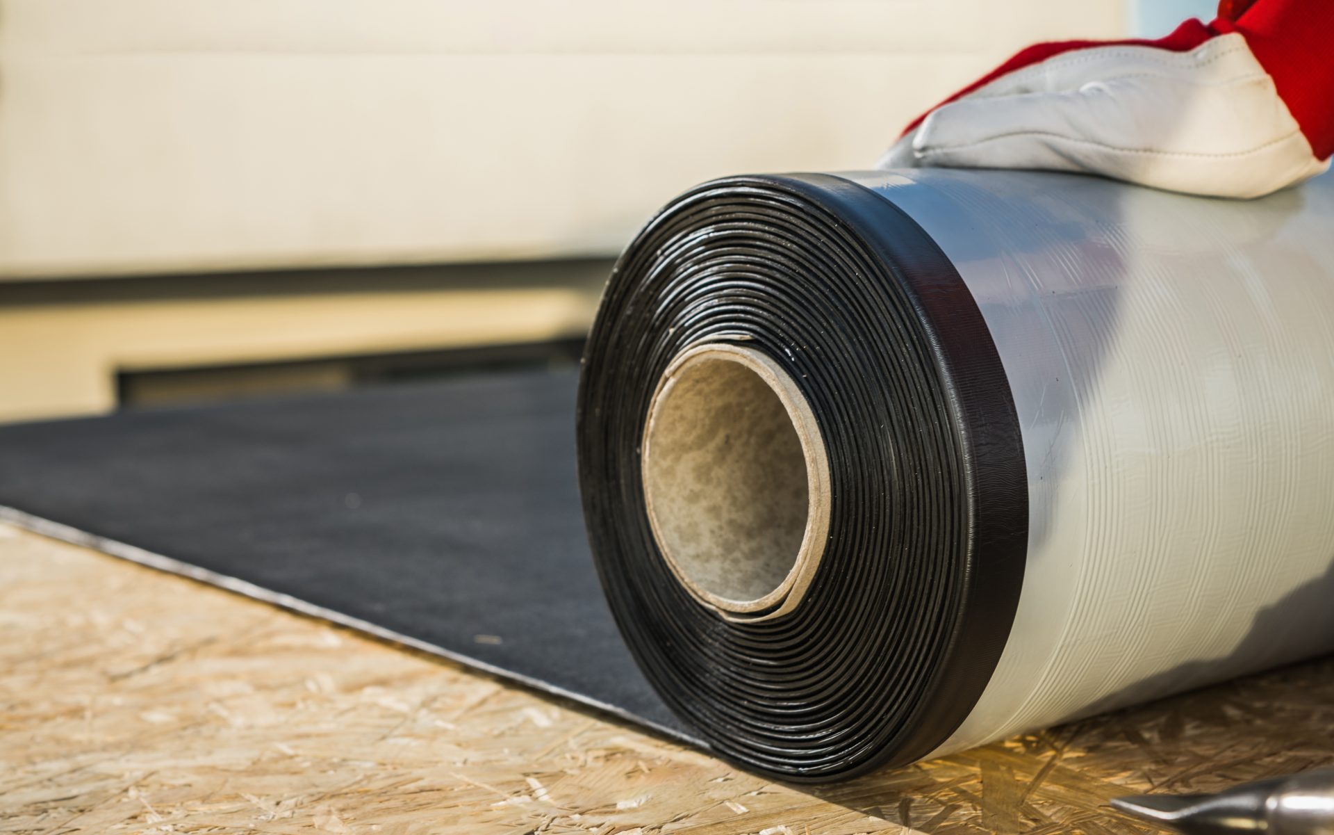 A self-adhered, “peel and stick” ethylene-propylene-diene monomer (EPDM) roofing membrane is installed.