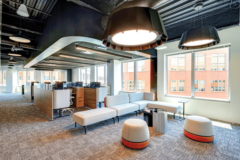 Thill says colors can reflect a company’s logo, match existing carpet, or deliver sustainable woodgrain finishes. With the Five Guys International Headquarters, OTJ was able to maintain an open plenum, define the space, and match the burger chain’s brand identity all in one.”