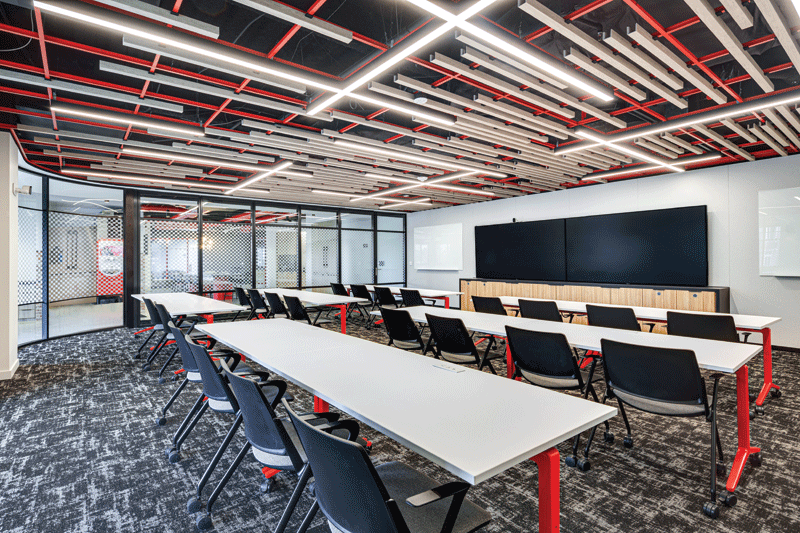 In its group collaboration and training room, Rockfon Cubegrid Open Plenum 23.8 mm (0.94-in.) metal ceilings were finished in a chili red. Rockfon Color-all Charcoal and bright white Rockfon Sonar acoustic stone wool ceiling panels were selected for the enclosed meeting rooms and offices.