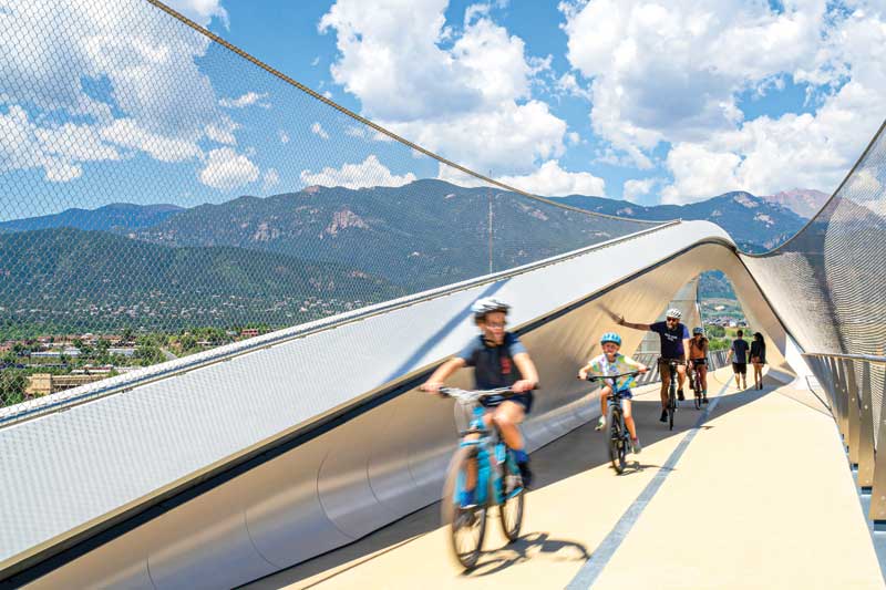 Metal shell: The architecture of the Park Union Bridge draws inspiration from the graceful, gravity-defying movements of athletes. This bridge ingeniously combines truss and arch forms into a curved hybrid steel structure, paying homage to the U.S. Olympic and Paralympic Museum (also designed by Diller Scofidio + Renfro), while serving as a landmark that offers visuals and pedestrian access to important areas in downtown Colorado Springs.