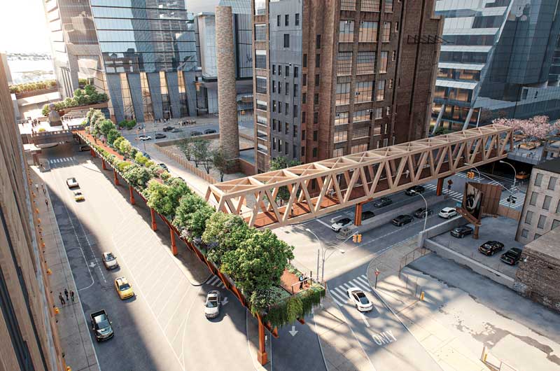 The High Line-Moynihan Connector, technically, a linear park made of two bridges over Dyer Avenue and West 30th Street, completes a chain of pedestrian pathways from Pennsylvania Station to Hudson Yards and the High Line to the West Village. Spanning183 m (600 ft), it offers a journey from Midtown West to the scenic High Line, blending contemporary spaces with greenery and history. Visitors can exit Moynihan Train Hall and cross Ninth Avenue into Brookfield Properties’ Manhattan West to find a 1.05 ha (2.6-acre) public plaza leading to the Timber Bridge, which runs along Dyer Avenue. After the Timber Bridge, they turn onto the tree-lined Woodland Bridge along 30th Street, which takes pedestrians to the High Line Spur. What connects these two bridges? Aesthetic unity, provided by Corten steel decking and bronze handrails to guide pedestrians.
