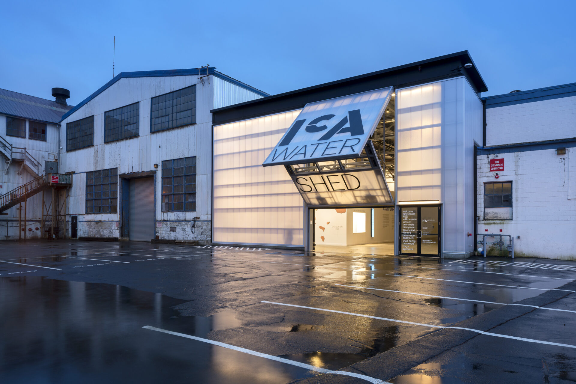 Evening view of the ICA Watershed with its translucent polycarbonate facade glowing from interior light, showcasing the bold logo on the bifold door.