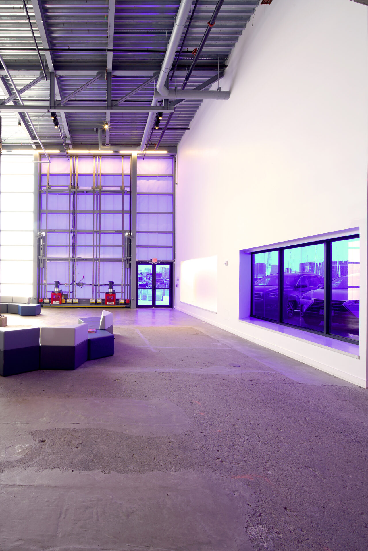 Interior of the ICA Watershed with exposed steel ceiling, large translucent bifold door, and purple lighting reflecting on gallery walls.