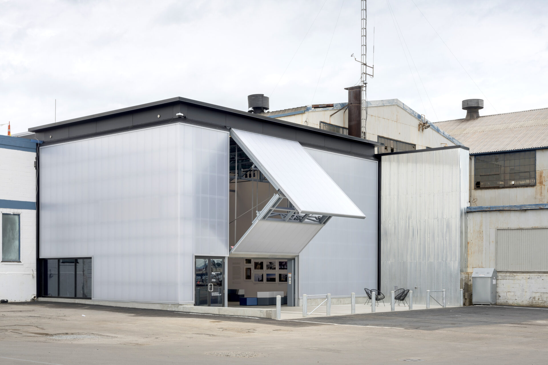 Exterior view of the ICA Watershed with a translucent polycarbonate bifold door partially open, contrasting the surrounding industrial buildings.