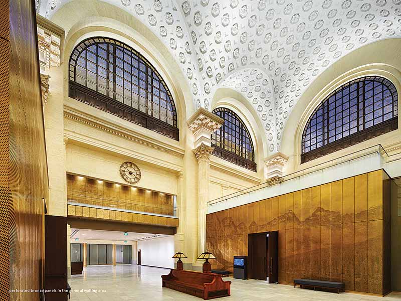 A renovation led by Diamond Schmitt Architects and KWC Architects in joint venture converted the Union Train Station in Ottawa, Ont. into a government administration building. Decorative panels formed from bronze (typically an alloy blending copper and tin) help define two Senate committee meeting rooms, showing scenes from both nature and history. The design team described their intent to purposefully include “both traditional and modern craft, establishing a rich narrative of distinctly Canadian landscape, imagery and identity.” Fabricators MCM 2001