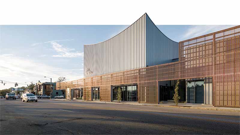 In their design of a new rehearsal and teaching space for Ballet Memphis, Grinder, Taber, & Grinder created a screen of semi-transparent copper facade panels that shield the front of the building. Copper panels from Petersen feature undulating profiles with circular perforations, providing both shade and a level of privacy from passing cars and pedestrians. The design team cited copper’s “inherent sculptural quality and natural patina process” as critical to the transformative look they sought to establish.