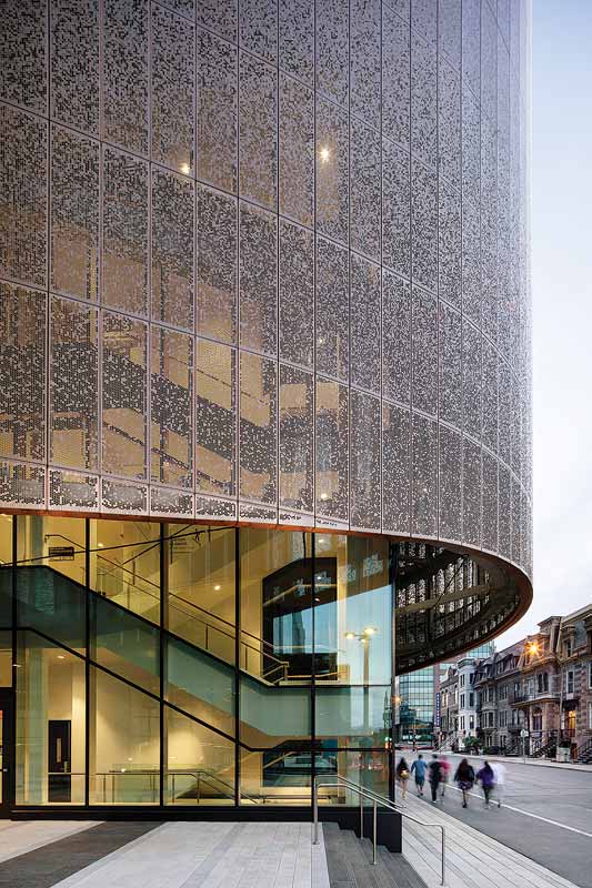 A triangular auditorium serves as a focus of the Centre Hospitalier de l’Université de Montréal (CHUM), a leading health center and medical research facility. Perforated copper panels envelop the structure, called the Pierre Peladeau Amphitheatre, beckoning visitors onto the CHUM campus. A blend of opaque copper panels and perforated, semi-transparent screens preserve the intimacy of interiors while also maintaining appropriate connections with the surrounding environment. The perforated sections have a multitude of small circles that recall “fine diaphanous lace,” according to the design team. The copper material also nods to copper featured on historic buildings across Montreal, Que. including City Hall, Windsor Station, and countless churches across the city.