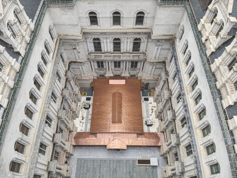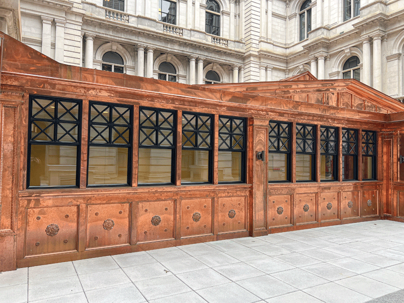 To accomplish this, the team developed extensive details and set installer qualification requirements for fabricating the custom ornamental copper architectural wall panels, standing-seam panels, and flat-seam copper panels on the project. The restoration work was completed by Greenwood Industries and VMJR Companies and included complete roof removal and replacement, as well as structural reinforcement and insulation. The team also carefully restored and/or recreated all copper elements, including flat-seam and standing-seam roofing, wall cladding, downspouts, intricate rosettes, egg-and-dart trim, and ornamental scrollwork integrated into the wall panels and new windows. They designed all elements to match the original profiles while, in some cases, improving the design to allow for superior performance.