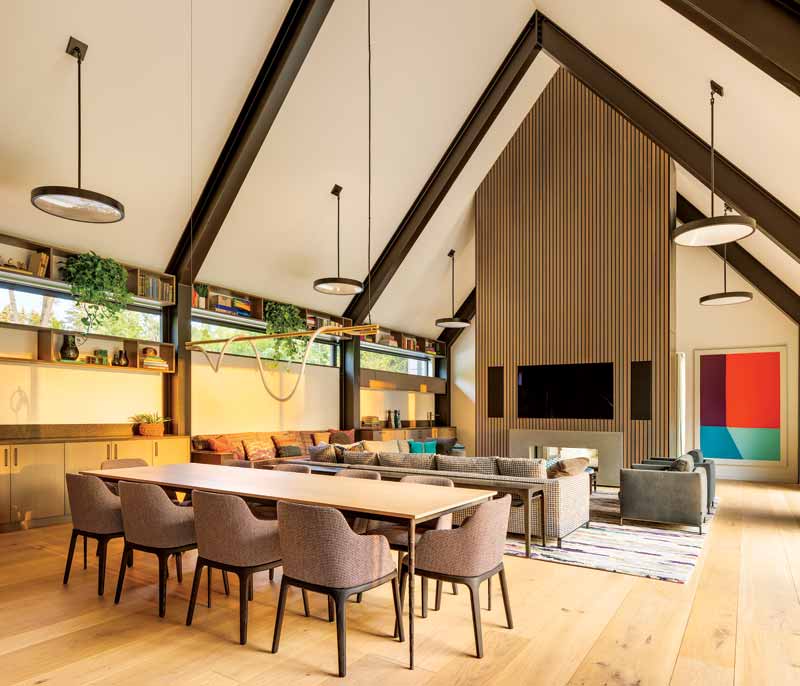 In considering the materials for the home, the client had two primary goals: durability and low maintenance. Each material on the home was selected with these goals in mind, especially the roof. Eco-friendly structural insulated panels (SIPs) form the roof, allowing 3.7-m (12-ft) spans between the steel bents without need for rafters or a ridge beam. Working with a reputable and experienced installer, Ianuzzi and team were confident the metal roof would provide the clients with decades of worry-free performance.