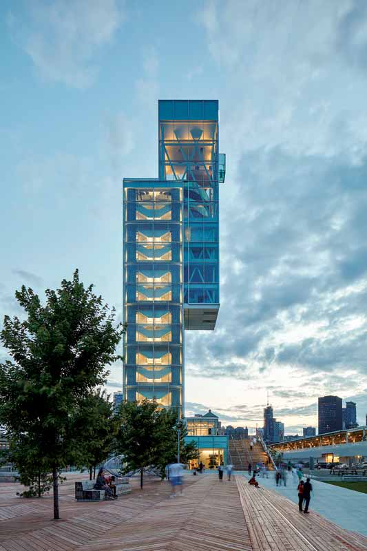 Among the project’s challenges, Provencher_Roy listed “construction on a pier with limited access and on backfilled soil with deep bedrock, conservation of the space for tourists, the arrival of cruise ships, accommodating events and minimal disruption of port operations.” A wind tunnel study and in situ tests were performed throughout the sequenced phases of curtain wall installation. Provencher_Roy says, “Informed by the project’s wind tunnel study, the structure was designed to attain the highest possible standards. The addition of a damping mass further enhances comfort for users of the Tower.”