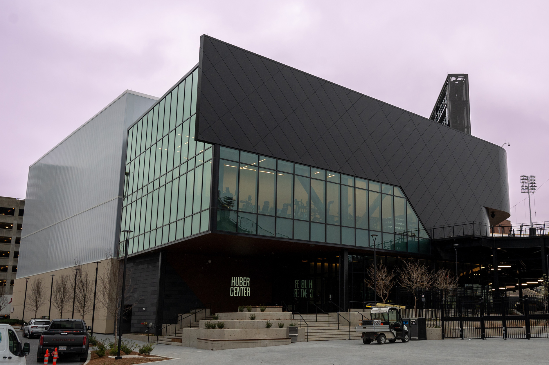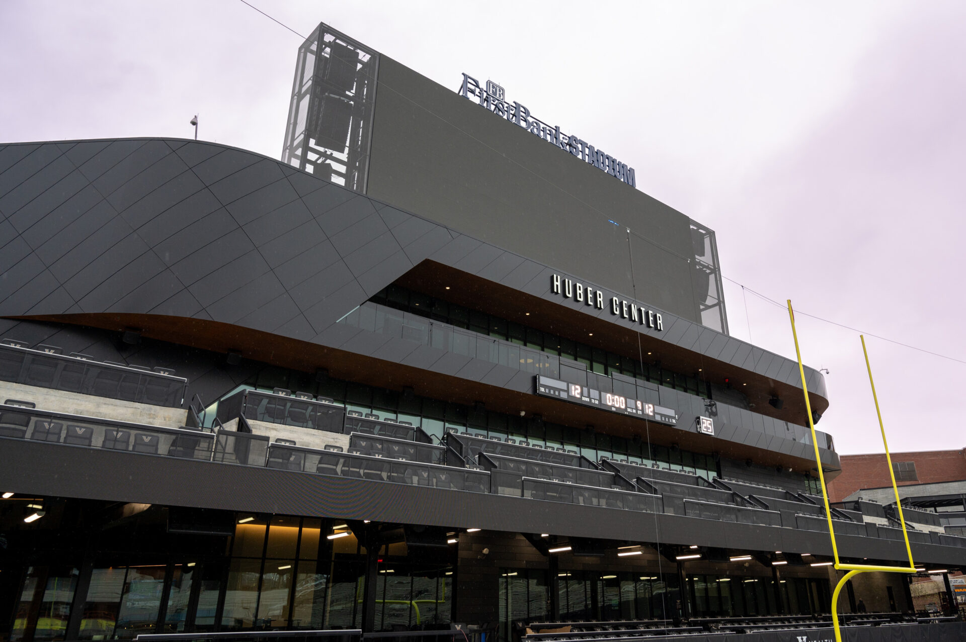 The building’s striking facade features black metal panels, installed in a cohesive pattern at a 45-degree angle. This pattern wraps around the structure, offering a sleek and prominent look from two perspectives: the football field-facing and outward-facing views. The bold black metal exterior design provides an ideal background for FirstBank Stadium’s football field, contrasting appealingly with the stark yellow of the goal post and the white sign bearing The Huber Center’s name. The structure’s exterior, which bears a scoreboard, is a focal point for game attendees.