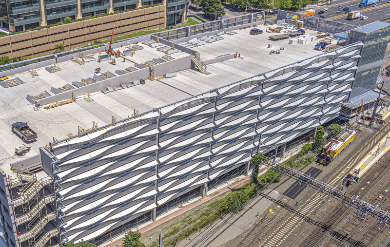 For Stamford Station’s parking garage facade, designers chose a unique, wave-like visual pattern in unitized assemblies. They also incorporated an integrated LED lighting design element in the cladding that can produce a wide variety of colors and patterns, creating a dynamic facade. “The sloped surfaces provide a surface to mount and power the LED lighting,” explains Scharr.