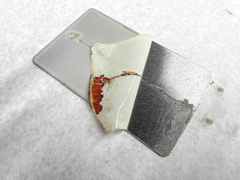 Peelable coating manufacturers can add many variations to just one basic peelable coating formulation. One obvious aspect is color. Peelable coatings can be left un-tinted for a clean, professional appearance or tinted to a variety of colors to blend into surrounding surfaces or to contrast and color code various components. Corrosion inhibitors can be added if the peelable coating will be used on metal surfaces. The images above show the performance of one peelable coating applied to a steel panel and subjected to a five percent salt fog solution at approximately 35 +/- 2 C (95 +/-3 F) for one week. The panel was scribed down the center to test corrosion creep. As a result of the modified adhesion characteristics of a peelable coating, it was more likely for corrosion to spread farther under the coating than if it had had normal adhesion. However, the panel performed considerably well despite the greater vulnerability, thanks in part to the specific corrosion inhibitor chemistry used. The coating peeled off easily to reveal a clean surface with only slight corrosion at the scribe and some staining at the bottom where the stand holding the panel had made it more susceptible to corrosion.