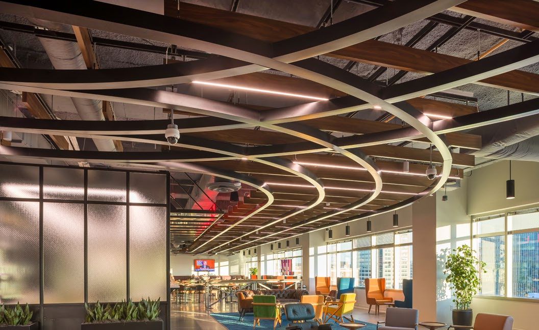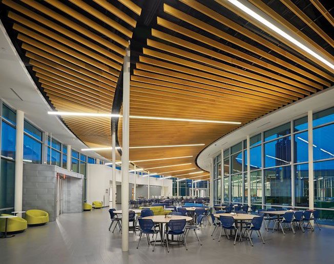 Wood Look of Radial Metal Ceiling Adds Warmth to Expansive Dining Area