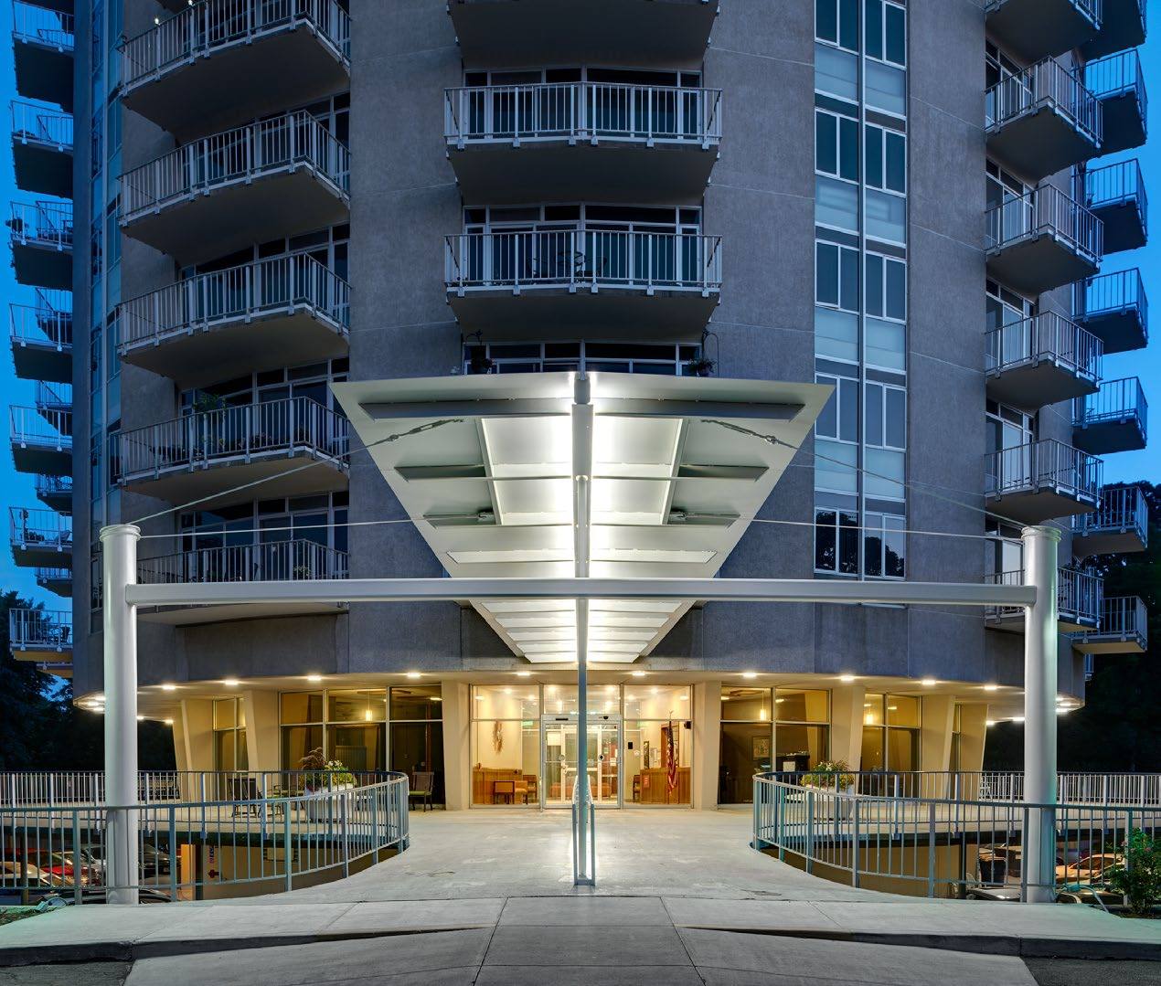 The existing historic, modern, cast-in-place building...