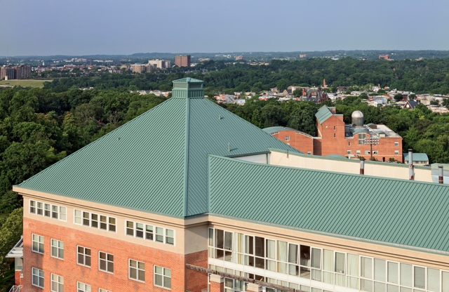 Leaking gutters and a batten seam metal roofing system that was losing its paint made it necessary to replace roofing and gutters on Inn...