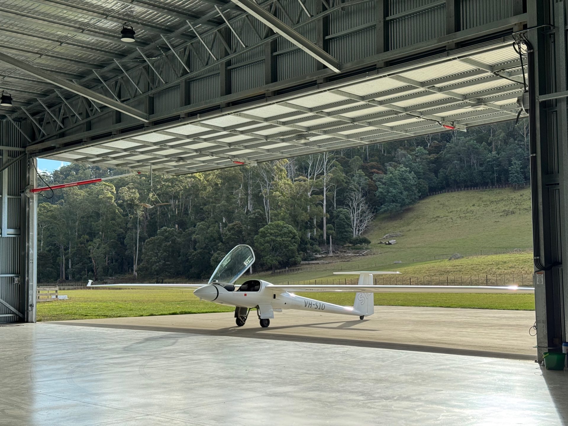The new Vale hangar, built by Bison Constructions of Scottsdale, TAS, is 32 x 24 m (105 x 78 ft). The steel hangar is covered in a shiny steel cladding on the exterior, has a white epoxy-coated floor and includes a single window looking out to Mount Roland and the surrounding landscape.