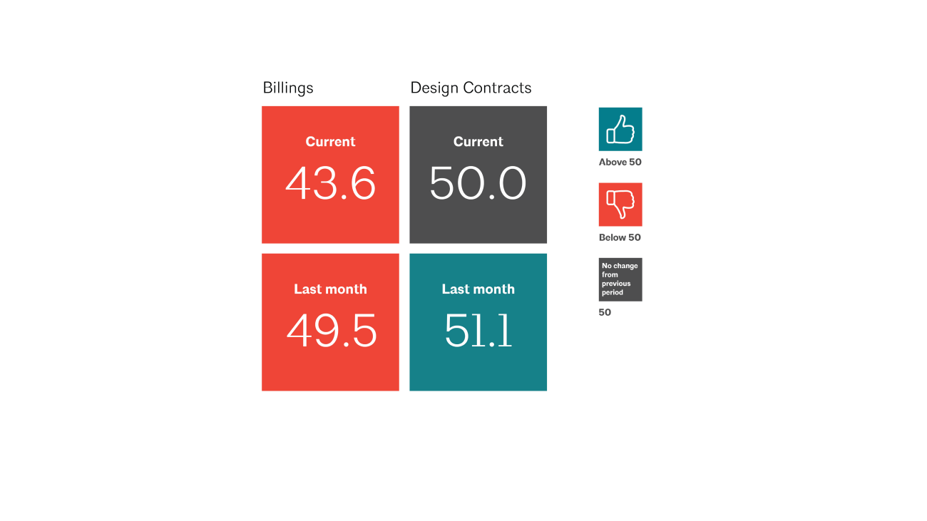 - Sector index breakdown: commercial/industrial (42.9); institutional (49.9); mixed practice (firms that do not have at least half of their billings in any one other category) (48.3); multifamily residential (44.2).