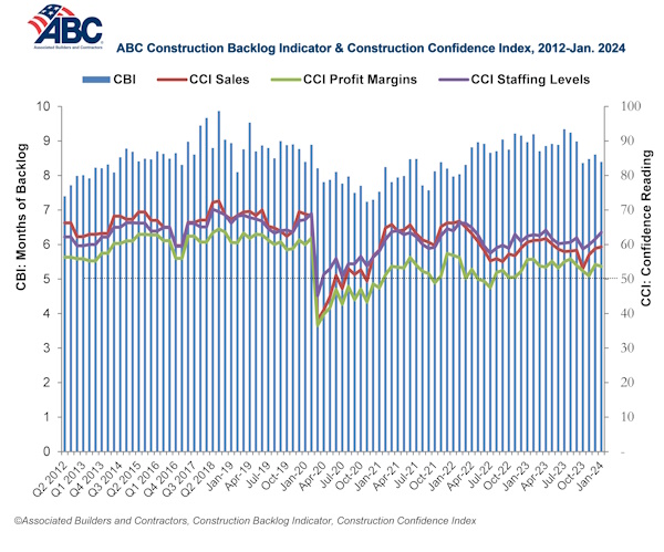 Associated Builders and Contractors (ABC) reported its Construction Backlog Indicator declined to 8.4 months in January, according to an ABC member survey conducted from Jan. 22 to Feb. 4. The reading is down 0.6 months from January 2023.