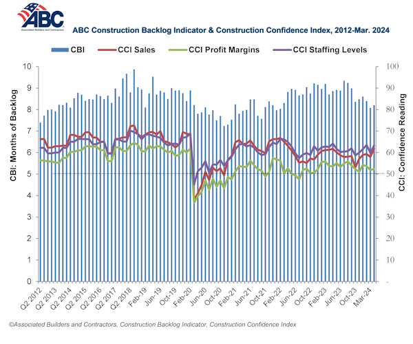 Associated Builders and Contractors (ABC) reported its Construction Backlog Indicator increased to 8.2 months in March from 8.1 months in February, according to an ABC member survey conducted March 20 to April 3. The reading is down 0.5 months from March 2023.