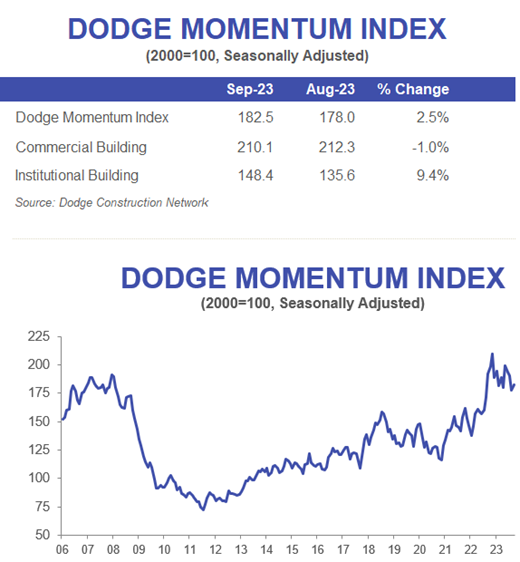 For the past 12 months ending in September, total nonresidential building starts were 3 percent higher than that ending September 2022. Manufacturing starts were 8 percent lower. Institutional starts improved by 8 percent, and commercial starts gained 4 percent.