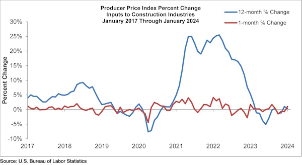 Construction input prices increased 1 percent in January compared to the previous month, according to an Associated Builders and Contractors (ABC) analysis of the U.S. Bureau of Labor Statistics’ Producer Price Index data. Nonresidential construction input prices increased 0.9 percent for the month.