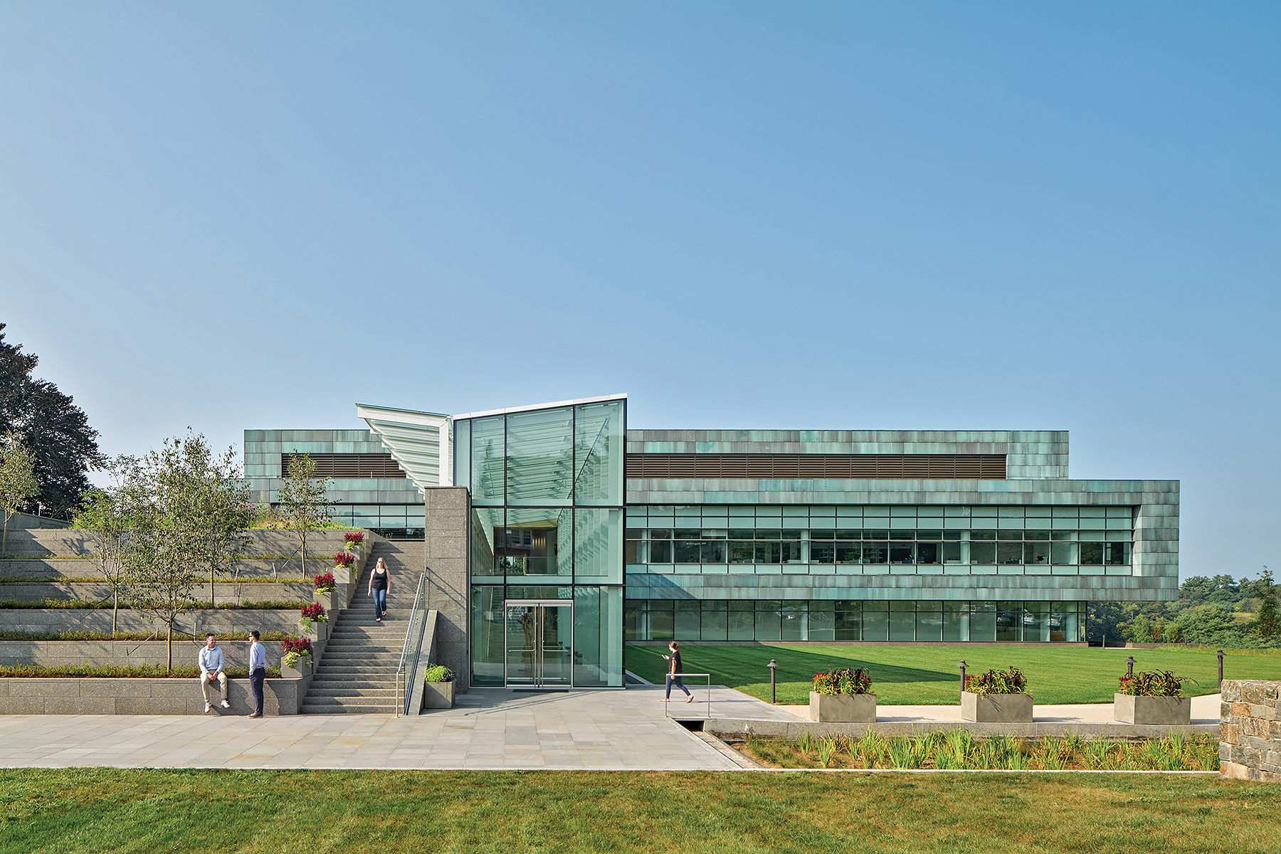 Modern glass and copper-clad expansion building at New England Biolabs in Ipswich, Mass., surrounded by landscaped green space.