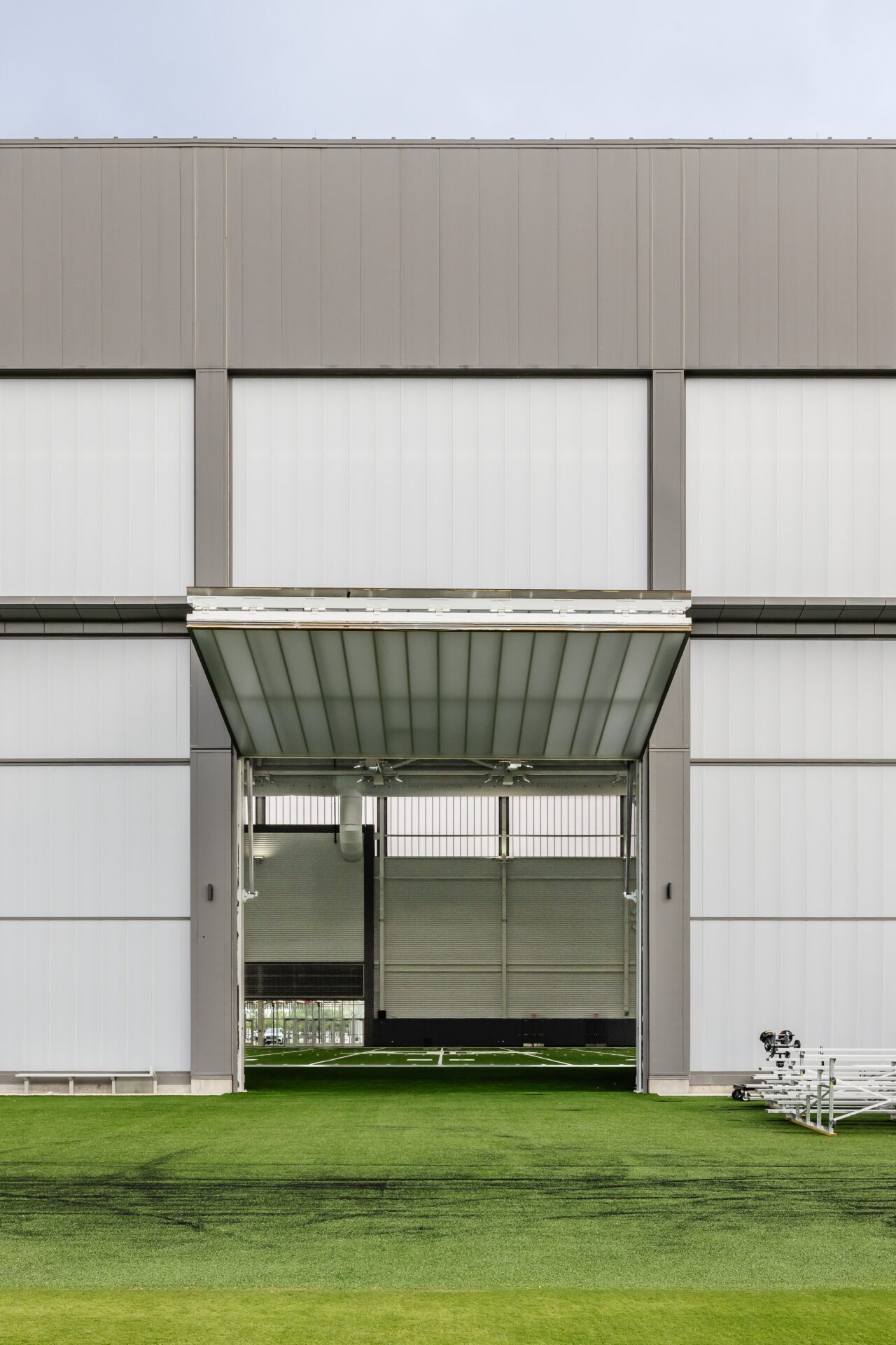 The Schweiss Doors liftstrap bifold system provides efficient movement between the Coolidge Football Performance Center’s 146.3 m (160 ft) indoor field sheltered within a massive steel fieldhouse and two 128 m (420 ft) outdoor fields.
