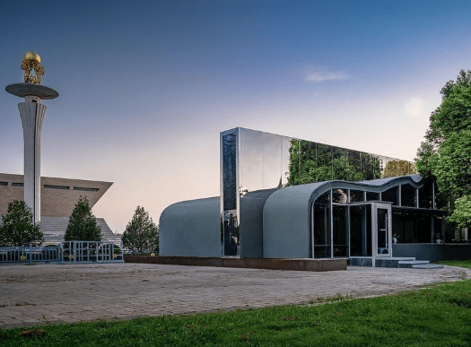 A curved steel-clad cafe with a gray roof, separated by a tall wall of mirrored metal.