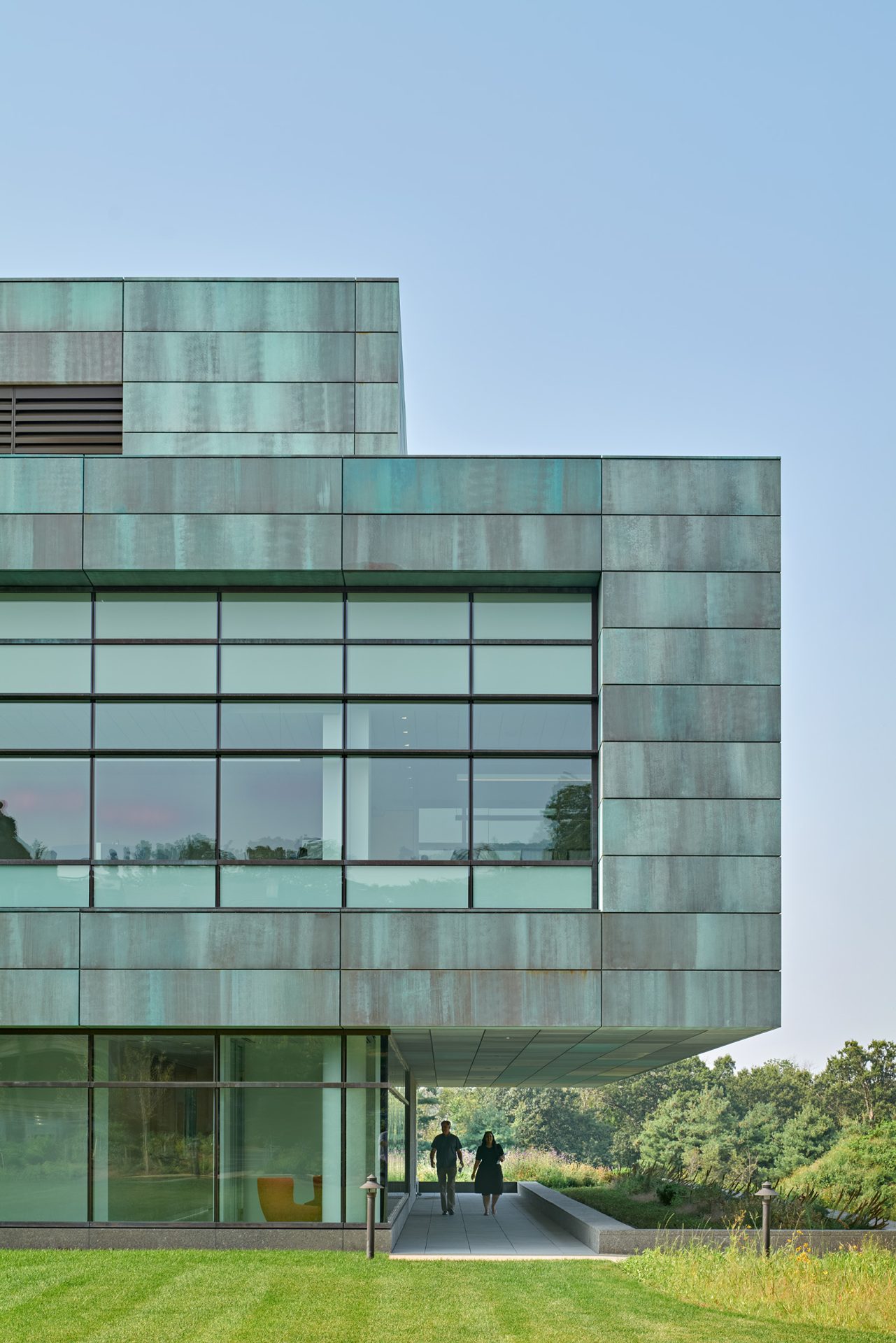 The structure’s characteristic green tones—developed through the process of applying acidic compounds to copper—inspire an elegant, aged appearance that coexists well with the site’s other structures. When the company approached the firm about a new addition to its campus, copper was a top request.