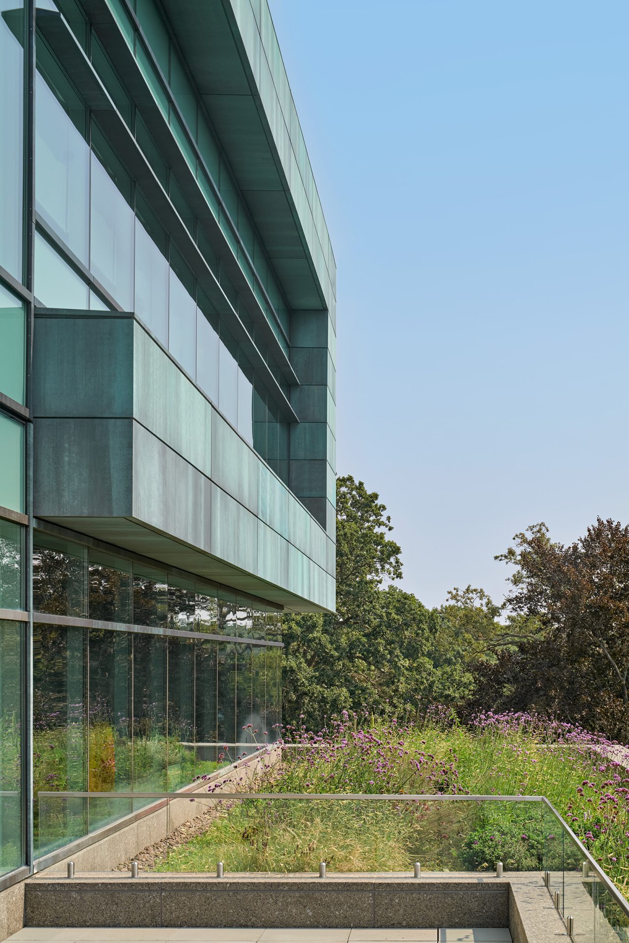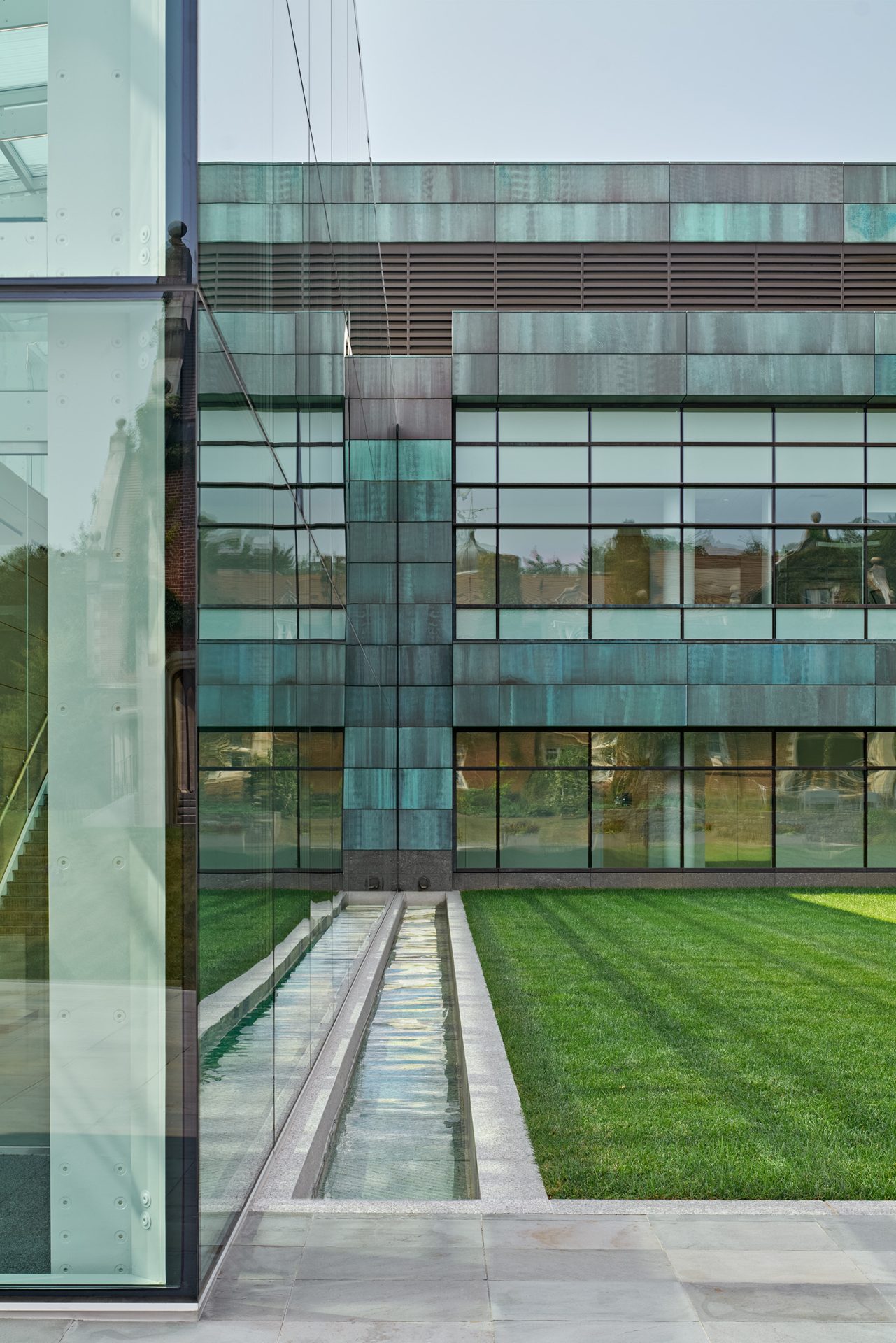 The project’s most significant sustainable feature isn’t its energy systems but its (2,787.1 m²) 30,000 sf of green roof. Born from the desire not to overwhelm the adjacent buildings, much of the new building is situated underground. The surrounding lawns and gardens are planted to let the landscape flow naturally around the building, so it never feels like a conventional roof. This limits the amount of copper actually on the structure and helps ensure the new structure does not visually overpower the adjacent historic mansion.
