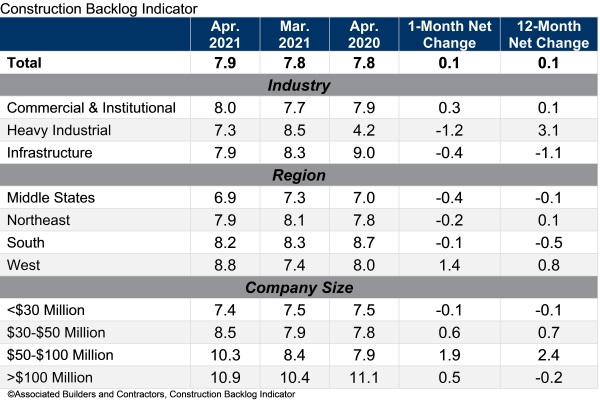 Associated Builders and Contractors reported today that its Construction Backlog Indicator rose to 7.9 months in April, according to an ABC member survey conducted April 20-May 5, 0.1 months higher than in March 2021 and April 2020.