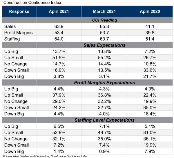 “There was little movement in contractor sentiment in April,” said ABC Chief Economist Anirban Basu. “Collectively, contractors continue to indicate that industry recovery will continue into the summer and beyond. The broader economy is poised to recover rapidly into 2022 as a potent combination of accumulated savings, stimulus, vaccinations and reopening drive consumer outlays and business spending higher. Available data indicate that while many segments, including the office market, continue to exhibit weak fundamentals, the worst is now past in terms of market deterioration.”