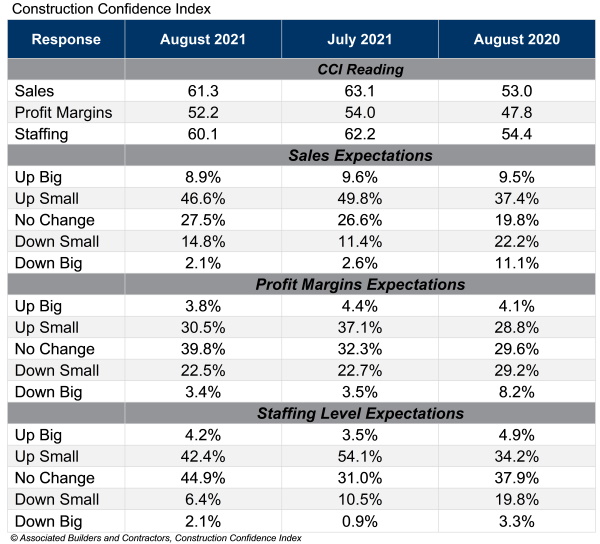 ABC’s Construction Confidence Index readings for sales, profit margins and staffing levels all fell modestly in August but remain above the threshold of 50, indicating expectations of growth over the next six months.