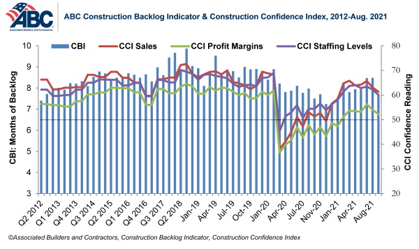 Associated Builders and Contractors reports today that its Construction Backlog Indicator fell sharply to 7.7 months in August, according to an ABC member survey conducted Aug. 19 to Sep.1. The reading is down 0.8 months from July 2021 and down 0.3 months from August 2020.