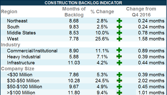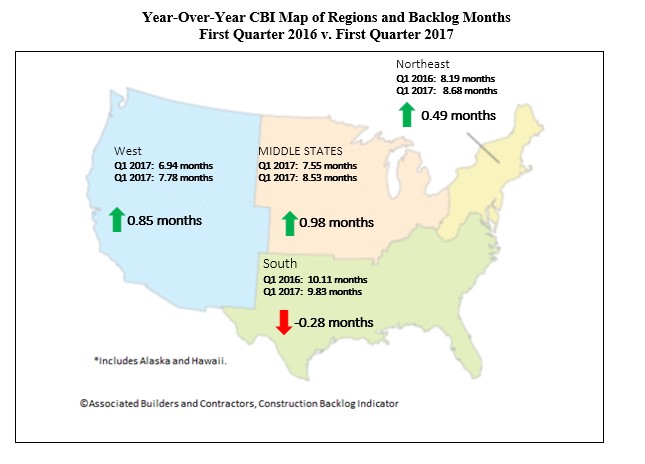 Associated Builders and Contractors (ABC) today reported that its Construction Backlog Indicator (CBI) rose to 9 months during the first quarter of 2017, up 8.1 percent from the fourth quarter of 2016. CBI is up by 0.4 months, or 4 percent, on a year-over-year basis.