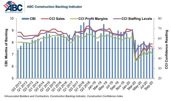 Associated Builders and Contractors reported today that its Construction Backlog Indicator fell to 7.5 months in September, a decline of 0.5 months from August’s reading, according to an ABC member survey conducted Sept. 20-Oct. 6. Backlog is 1.5 months lower than in September 2019.