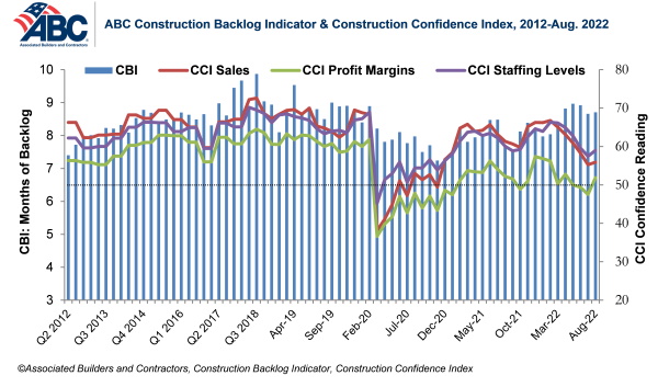Associated Builders and Contractors reports today that its Construction Backlog Indicator remained unchanged at 8.7 months in August, according to an ABC member survey conducted Aug. 22 to Sept. 7. The reading is a full month higher than in August 2021.