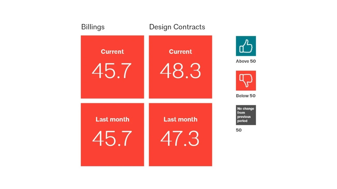 Despite improving conditions in the broader economy, September marked the 20th consecutive month of declining billings for architecture firms, according to the latest data from the American Institute of Architects (AIA) AIA/Deltek Architecture Billings Index (ABI). The ABI score of 45.7 for the month indicates that the majority of firms continued to experience a decline in their billings.