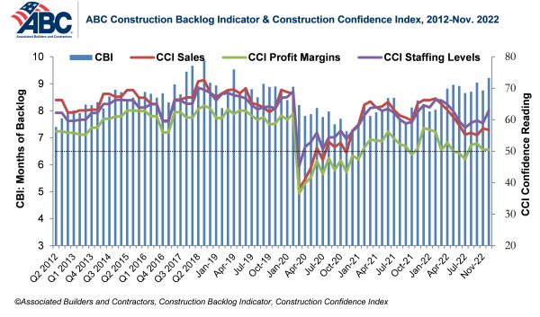 Associated Builders and Contractors reports today that its Construction Backlog Indicator increased to 9.2 months in November, according to an ABC member survey conducted Nov. 21 to Dec. 6. The reading is 0.8 months higher than in November 2021.
