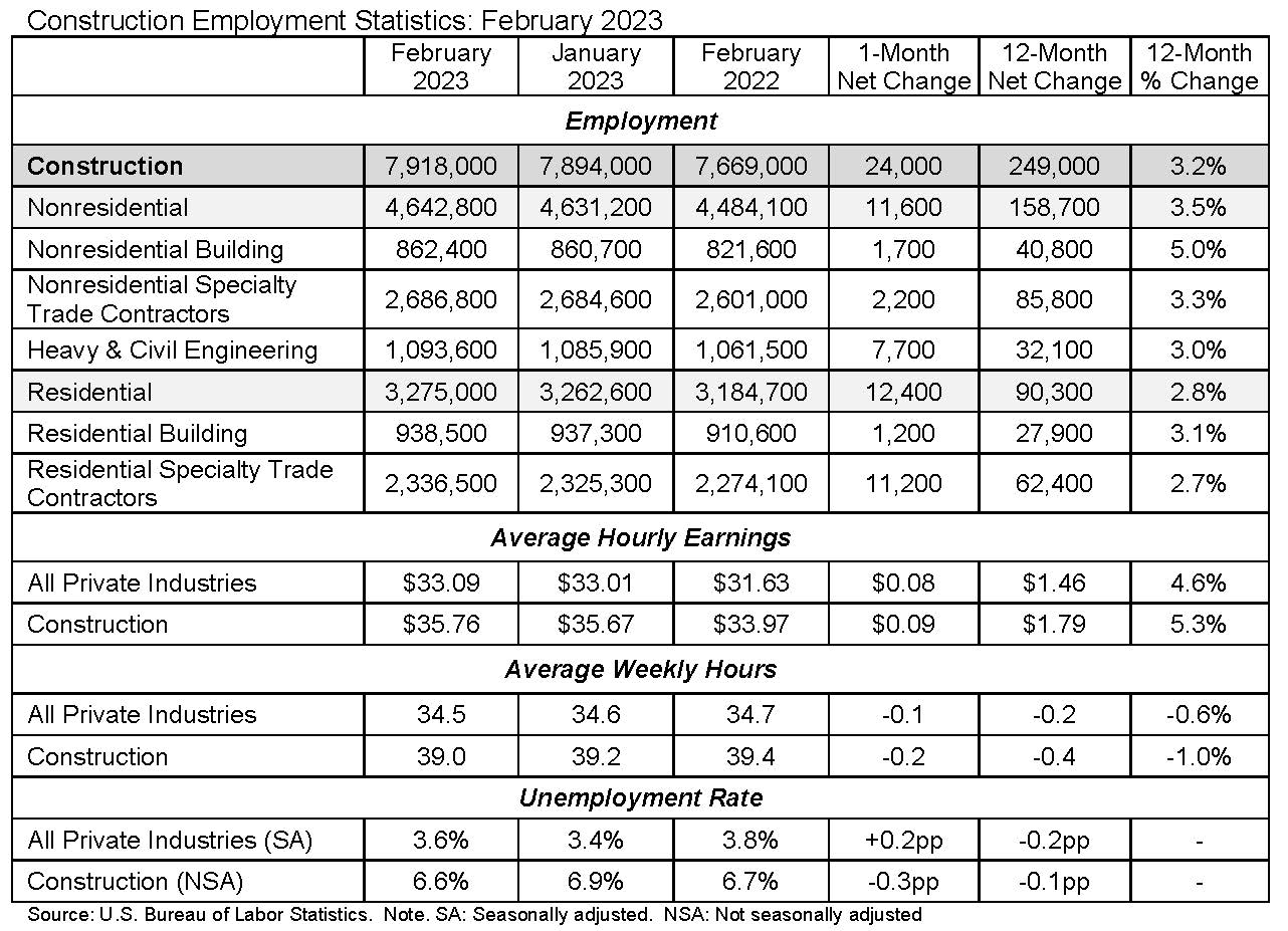 The construction industry added 24,000 jobs on net in February, according to an Associated Builders and Contractors analysis of data released today by the U.S. Bureau of Labor Statistics. On a year-over-year basis, industry employment has risen by 249,000 jobs, an increase of 3.2%.