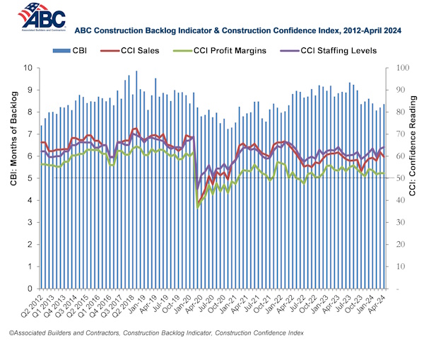 Associated Builders and Contractors (ABC) reported its Construction Backlog Indicator increased to 8.4 months in April, according to an ABC member survey conducted April 22 to May 6. The reading is down 0.5 months from April 2023, and up 0.2 months from the prior month.