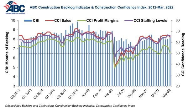 Associated Builders and Contractors reported today that its Construction Backlog Indicator increased to 8.3 months in March, according to an ABC member survey conducted Mar. 22 to April 5. The reading is up 0.5 months from March 2021.