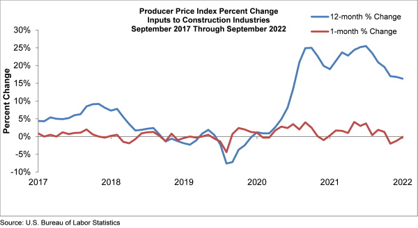 Construction input prices are up 16.3% from a year ago, while nonresidential construction input prices are 15.9% higher. Input prices were down in six of 11 subcategories on a monthly basis. Steel mill prices fell 6.7% and iron and steel prices dropped 5.4%. Natural gas prices rose 3.1%, while crude petroleum prices were down 3.4% in September. Overall producer prices expanded 0.4% in September, a larger increase than the consensus estimate of 0.2%.