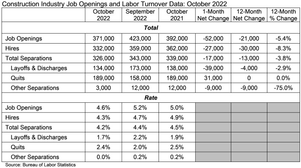 The construction industry had 371,000 job openings in October, according to an Associated Builders and Contractors analysis of data from the U.S. Bureau of Labor Statistics’ Job Openings and Labor Turnover Survey. JOLTS defines a job opening as any unfilled position for which an employer is actively recruiting. Industry job openings decreased by 52,000 last month and are down 21,000 from the same time last year.