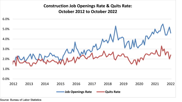 “However, there are signs that labor shortages are beginning to abate across all segments,” said Basu. “The economy-wide share of workers who quit their job fell to the lowest level since May 2021, indicating that the U.S. economy continues to soften as it edges toward likely recession next year. Since many construction segments lag behind the performance of the broader economy by several months, it is conceivable that construction industry job openings will remain elevated for a time even as the U.S. economy weakens. This is reflected in ABC’s most recent Construction Confidence Index, which shows that nearly half of contractors intend to increase their staffing levels over the next six months.”